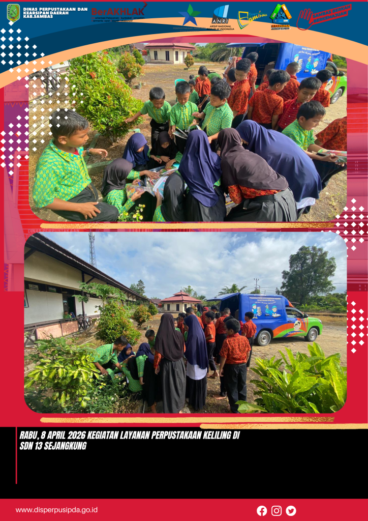 Sambas- Rabu, 8 April 2026, Dinas Perpustakaan dan Kearsipan Daerah Kabupaten Sambas melalui Bidang Pengolahan, Layanan dan Pelestarian Bahan Perpustakaan kembali melaksanakan kegiatan Layanan Perpustakaan Keliling di SDN 13 Sejangkung.