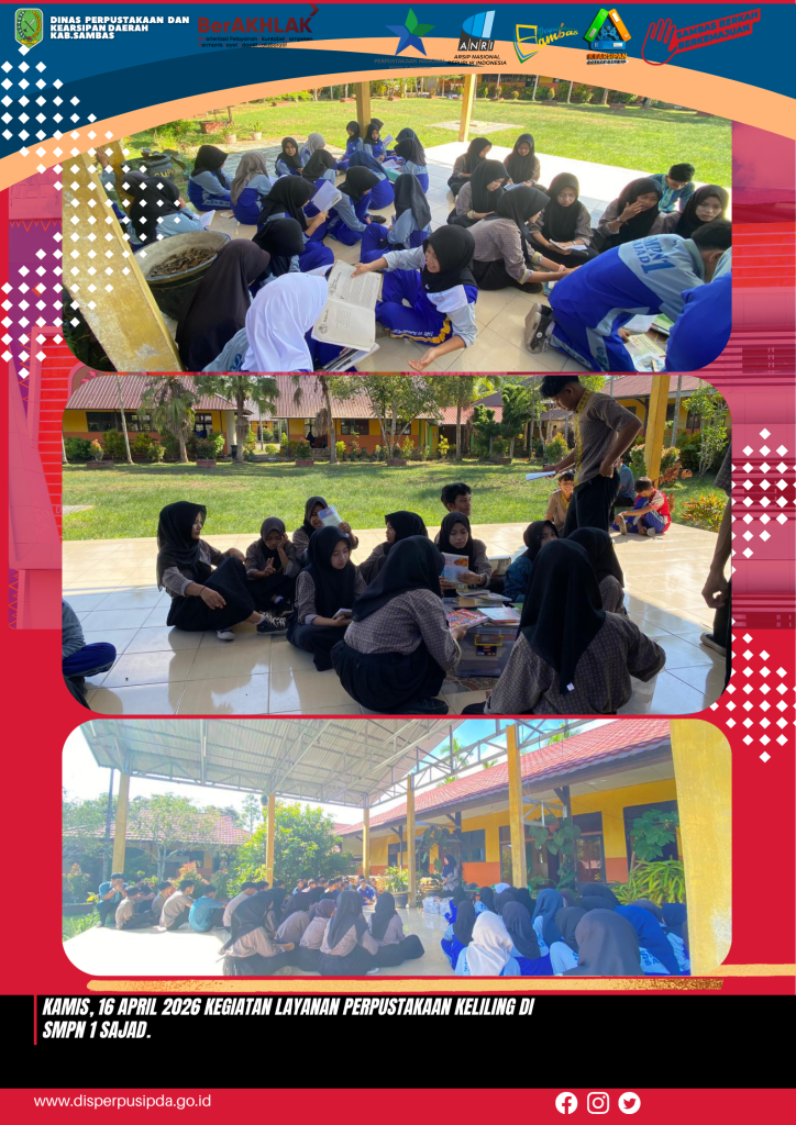 Sambas- Kamis, 16 April 2026, Dinas Perpustakaan dan Kearsipan Daerah Kabupaten Sambas melalui Bidang Pengolahan, Layanan dan Pelestarian Bahan Perpustakaan kembali melaksanakan kegiatan Layanan Perpustakaan Keliling di SMPN 1 SAJAD.